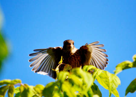 A vibrant bird with orange and gray feathers spreads its wings wide, illuminated by soft sunlight. This moment captures the essence of spring as nature awakens.