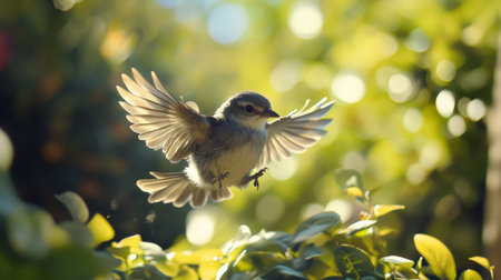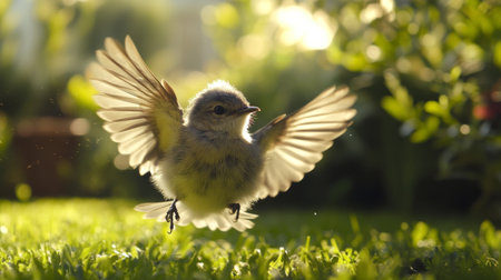 A dynamic photo of a baby bird learning to fly, flapping its wings in a sunlit backyard, capturing the essence of growth and exploration in the natural world.