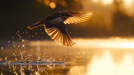 a bird gracefully soars through the air, near a shimmering body of water, basking in the warm sunlight. this forestpunk-inspired photograph captures the beauty of nature with its photorealistic representation. the vibrant colors of light red and dark brown create a captivating visual contrast. tilt-shift lenses add a unique perspective, while the lively illustrations and dappled lighting enhance the overall charm. a subtle rim light