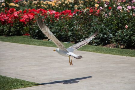 Single seagull in the garden with beautiful roses