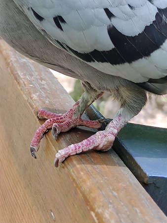 The legs of a pigeon bird and part of the torso on a wooden bench close-up. One of the legs is crippled, missing two fingers