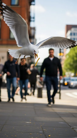 Seagull flying in the city, London, England, UK