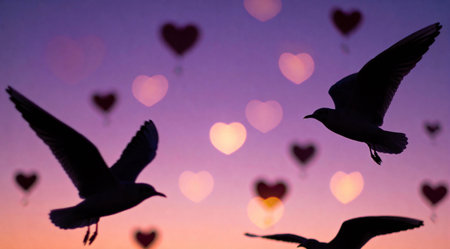 A creative digital illustration depicting Dreamy bokeh orbs of birds and floating hearts in twilight sky, blurred depth-of-field composition, purple twilight soft focus lighting, atmospheric abstract photography style, enchanting serene mood,. This AI-generated artwork features unique visual elements suitable for various commercial and editorial applications. AI-generated illustration.