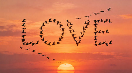 A creative digital illustration depicting Abstract flock birds spelling 'LOVE' in sky formation, aerial V-shape composition, sunset silhouette lighting, typographic abstract style, declarative romantic mood, wingspan details.. This AI-generated artwork features unique visual elements suitable for various commercial and editorial applications. AI-generated illustration.