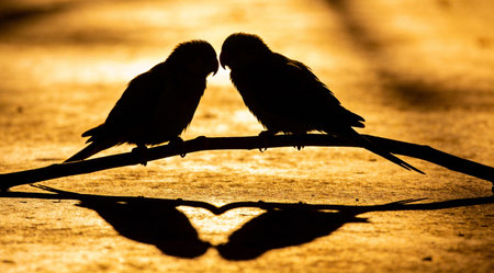 Dramatic backlit silhouette style evoking poetic romance and natural beauty in avian motifs during golden hour ambiance. Ideal for romantic marketing, greeting cards, wedding graphics, and love-themed merchandise targeting couples and event planners. The symbolic shadow artistry delivers emotional depth and versatile commercial appeal. . AI-generated digital illustration. AI-generated illustration.