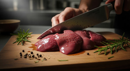 A chef hands slice raw chicken livers on a wooden cutting board, seasoned with black peppercorns and fresh rosemary, in a professional kitchen setting. Focus on food preparation and fresh ingredients.