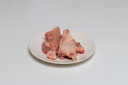 Chicken skeleton on a white plate. Meat for chicken soup.