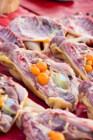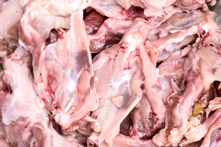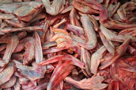 Dead hens on a table. Numerous legs together in the market. White meat of poultry for human consumption.