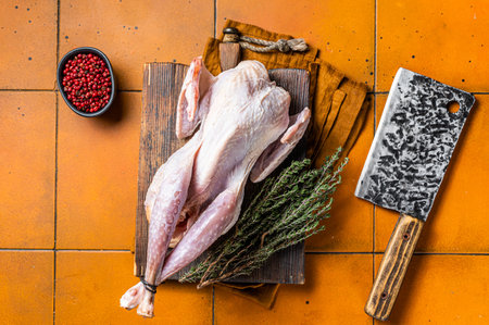 Farm Raw Guineafowl, guinea fowl with herbs ready for cooking. orange background. top view.