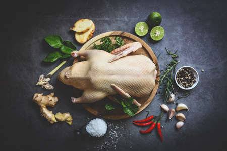 Raw duck with herb spices ready to cook on dark palte, Fresh duck meat on wooden tray for food, Raw whole duck - top view