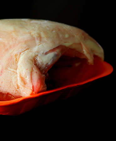 A piece of chilled red pork and a blurred nutria carcass on a supermarket display.