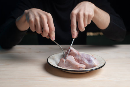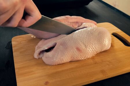 Cutting poultry meat. Broiler breast, chicken meat on a cutting board.