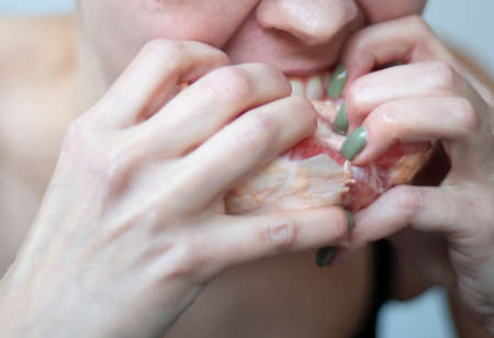 The girl is biting a grapefruit. Close-up of juicy fruit in the mouth.
