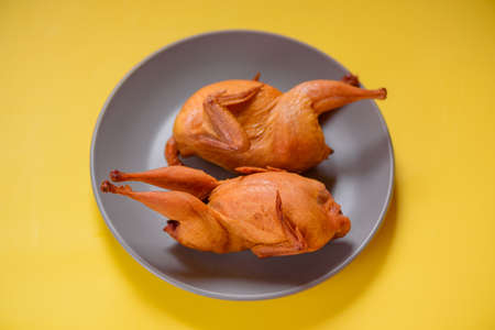Smoked quail meat on a plate. A photo. poultry, quail, cooking