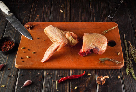 Chicken wings and drumsticks are placed on a wooden cutting board. Spices like chili and garlic surround the meat. Knives are visible alongside the board, indicating food preparation.