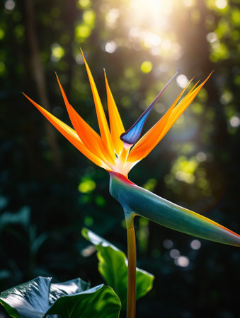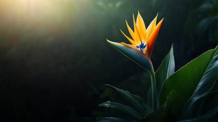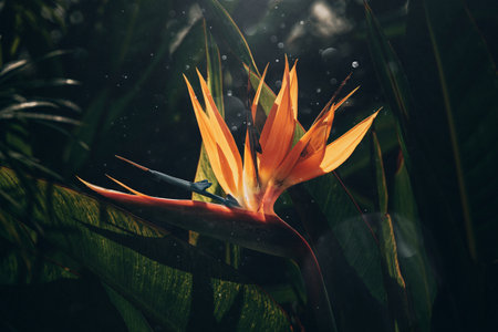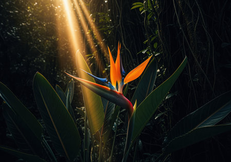 Exotic bird of paradise flower showcasing its unique orange and blue bloom, highlighted by striking sunbeams cutting through dense, dark jungle foliage.