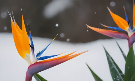 Strelitzia reginae or bird of paradise flower in the snow