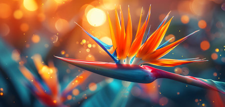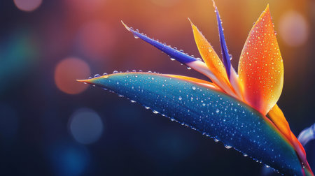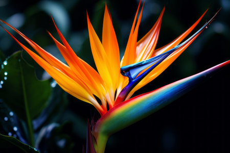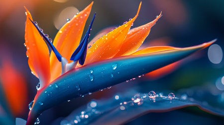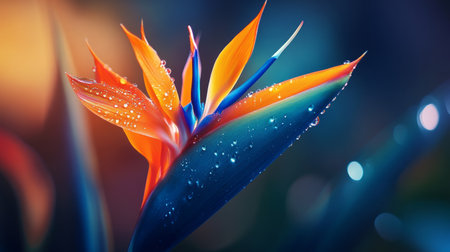 bird of paradise flower with vibrant orange and blue tones, water drops enhancing details, tropical feel generative ai