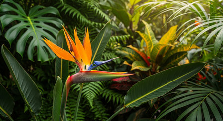 Bird of paradise flower in the forest. Ai generated.