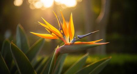 Bird of paradise flower in the garden at sunset, beautiful nature background