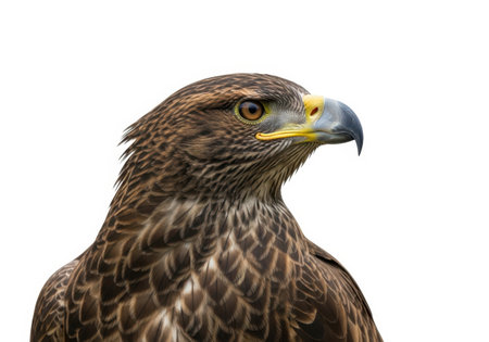 Close-up portrait of a powerful brown eagle, its sharp yellow beak and intense gaze conveying wild majesty. A stunning depiction of avian prowess and natural beauty captured in detail.
