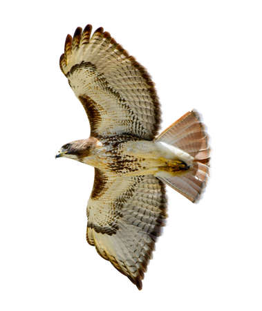 Wild Flying bird of prey, juvenile Red-tailed hawk, Buteo jamaicensis Viewed from below, wings spread, tail flared. Isolated cutout on white background