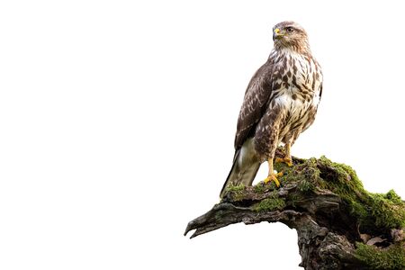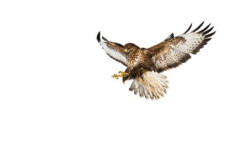 Wild common buzzard, buteo buteo, in flight catching prey with claws isolated on white background. Landing free bird with spred wings cut out on blank.