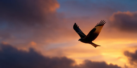 Bird silhouette flying at sunset with colorful sky and clouds creating peaceful and inspiring scene