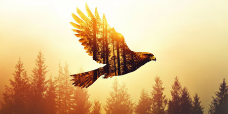A swift falcon diving, its body filled with the silhouette of a sunlit forest with towering trees.