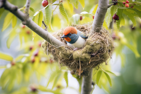 A beautiful scene of a vibrant bird nestled in a cozy nest amid lush green leaves. This captivating wildlife moment captures nature's elegance and serenity.