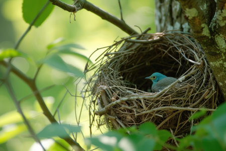 A captivating image of a blue bird nestled in a delicate nest among lush green leaves, evoking a sense of peace and connection to nature's beauty.