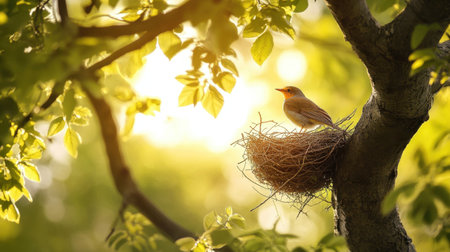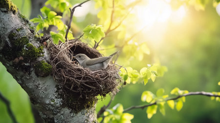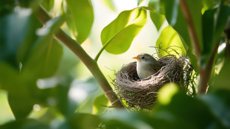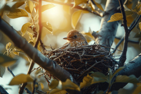 A tiny fledgling sits nestled in its carefully woven home, bathed in the warm, golden glow of the morning sun. It waits patiently, a symbol of new life, hope, and the fragile beauty of a new beginning in the natural world.