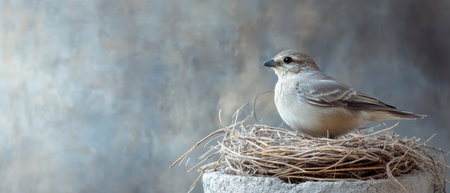 A small bird sits comfortably in a nest made of twigs on a stone pedestal. The soft background creates a serene atmosphere as the bird enjoys its peaceful environment.