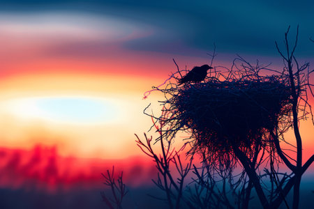 A bird is sitting on a nest in the middle of a sunset. The bird is silhouetted against the bright orange and pink sky, creating a serene and peaceful atmosphere. The nest is made of twigs and leaves
