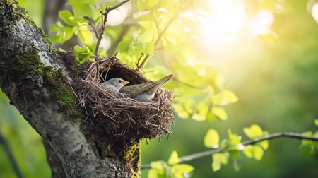 A feathered guardian sits watchfully in its cozy nest surrounded by fresh spring foliage and warm sunlight.