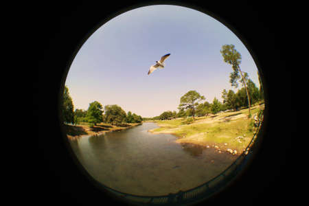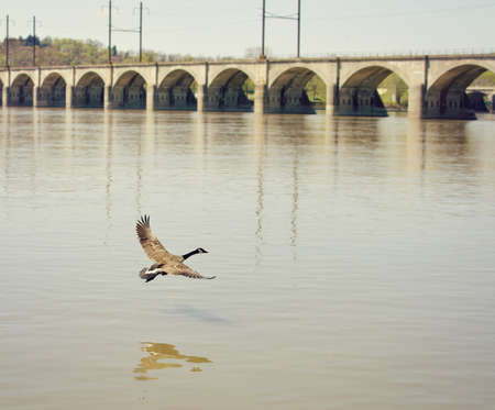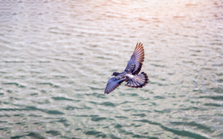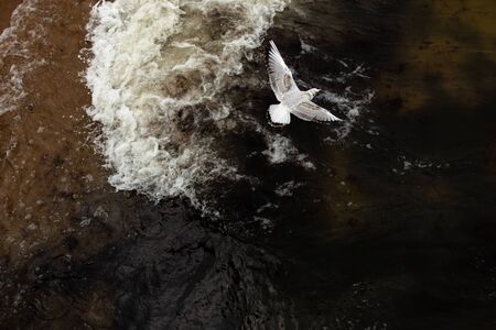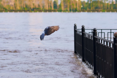 The flapping of the wings of a dove in flight over a seething river during a flood. Selective focus.