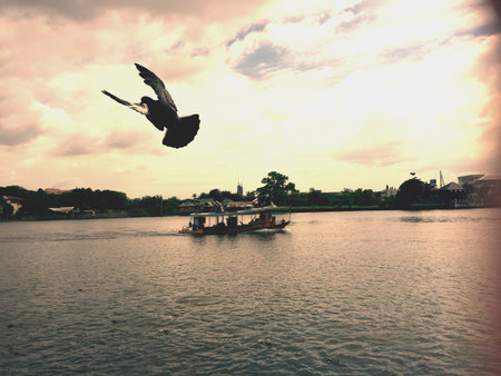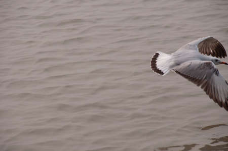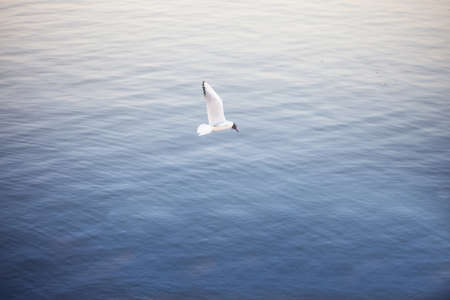 One Seagull birds floating on sea surface under warm evening light at Bang Pu in Samut Prakarn near Bangkok - Thailand