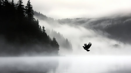 A bird glides effortlessly above the calm waters of a serene lake, surrounded by a soft fog that blankets the landscape at dawn. The tranquil atmosphere enhances the sense of peace.