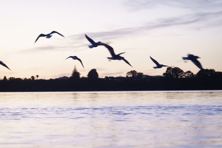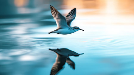 A bird soars gracefully above serene water at sunrise, casting a delicate reflection. Pastel colors blend harmoniously in the early morning sky, creating a tranquil atmosphere.