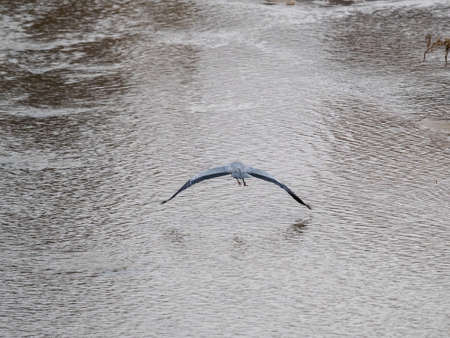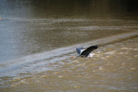 Gray heron flies over the water. Wild marsh bird with long legs and beak