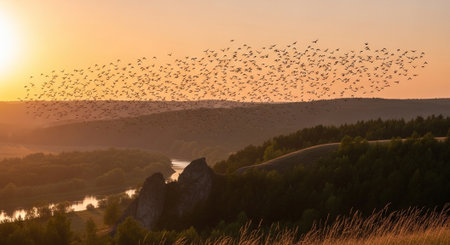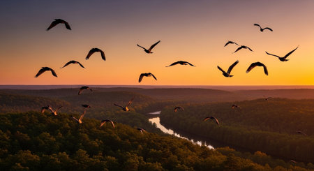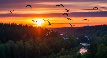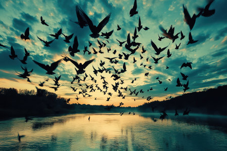 A flock of birds takes flight over a serene river at dusk, creating a mesmerizing silhouette against the colorful sky.