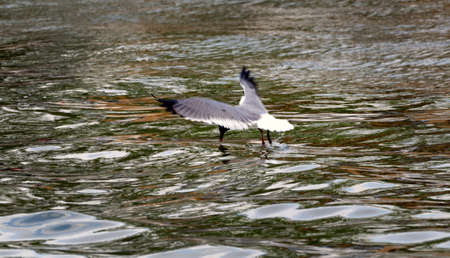 Black headed gull on its summer plumage, also called chroicocephalus ridibundus flying with its wings while over the waters of Palic Lake, a major natural landmark of Voivodina, Serbia, during an afternoon.