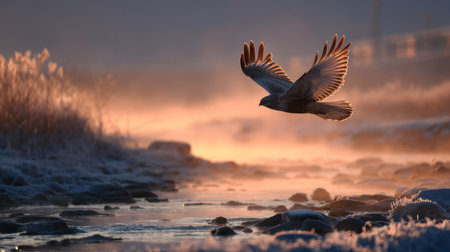 Hawk soaring over a frozen river at dawn with mist rising and golden sunlight reflecting on the water