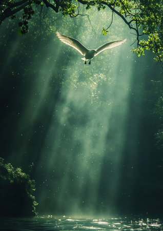 a white sparrow gracefully soars through a sunlit forest, embodying psychological symbolism. this captivating image captures the essence of norwegian nature, with its stunning backdrops and vibrant energy. taken by dimitry roulland, this depiction of animals showcases the lively and energetic spirit of the natural world. iso 200. ai generated
