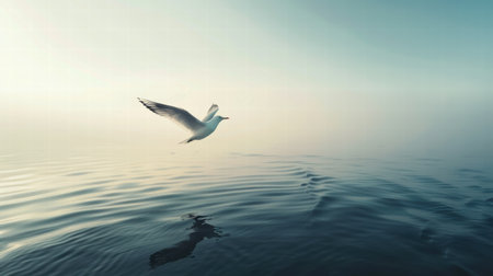 A graceful seagull takes flight over a tranquil river shrouded in morning fog, capturing a serene moment of nature's beauty and calm reflections.