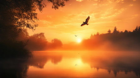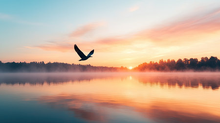 A tranquil scene showcasing a bird gracefully flying over a misty lake at sunrise, reflecting a peaceful and serene atmosphere ideal for nature lovers.