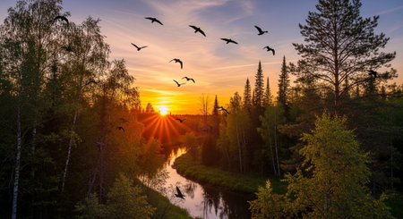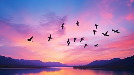 A beautiful sunrise casts vibrant colors across a calm lake, where flocks of birds soar gracefully above the shimmering water, creating a serene and peaceful atmosphere.