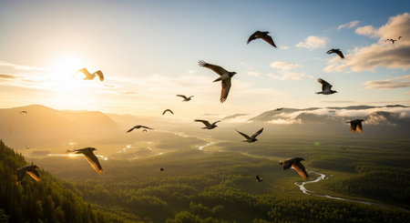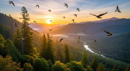 Beautiful summer landscape with mountains, forest and flying birds at sunset
