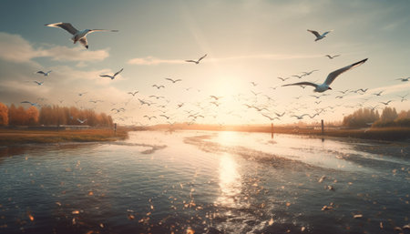 Sunset over water, seagull flying, tranquil scene, reflection in pond generated by artificial intelligence