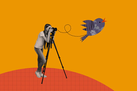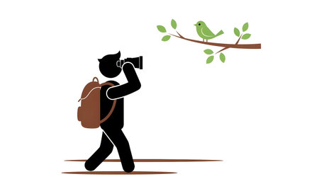 Stick figure photographer with backpack takes picture of a small bird on a tree branch.